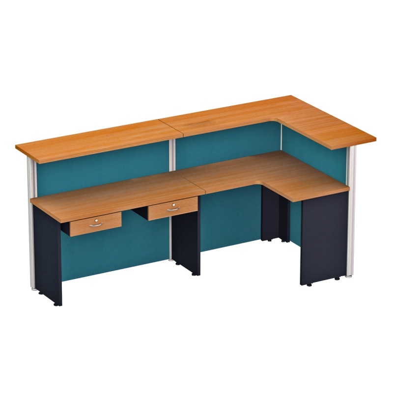 L-shaped wooden counter table consists of a work table with side tables, 2 center drawers, and a set of partitions with counter top.