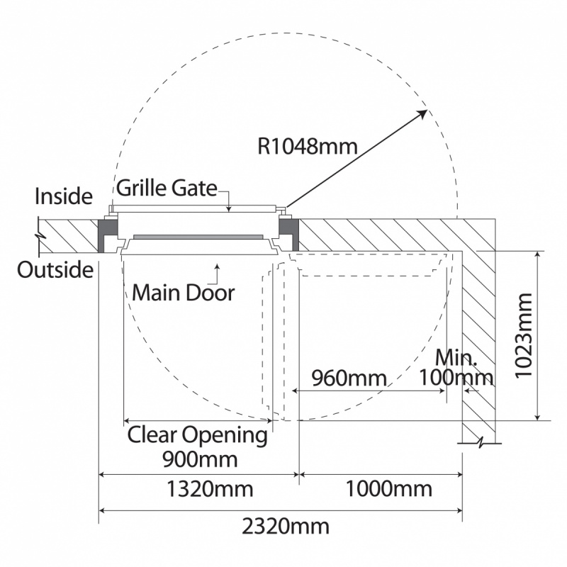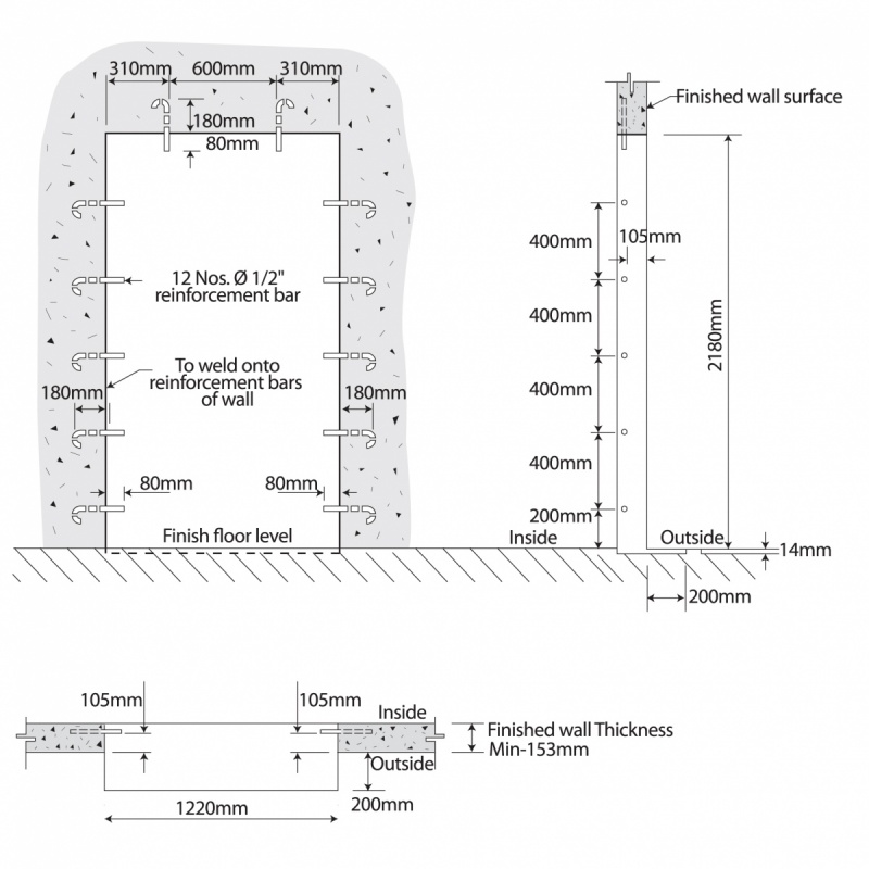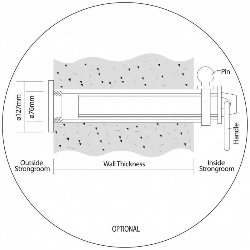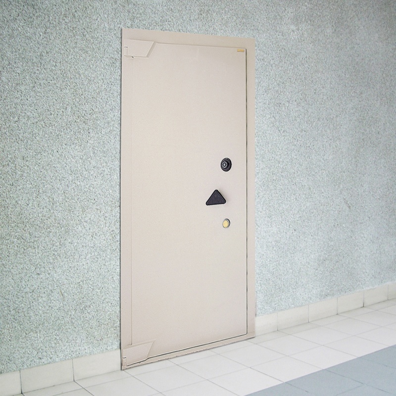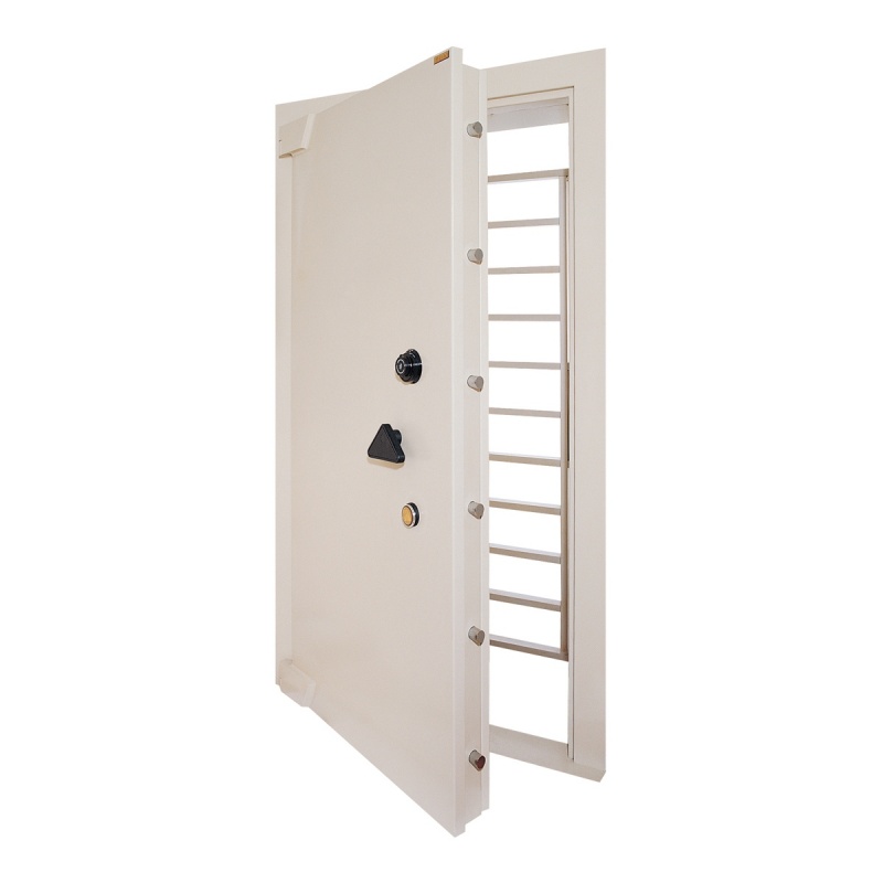 Equipped with a rotary dial lock and additional key lock for enhanced security, designed to be embedded into concrete walls to create a vault (secure room) for storing large quantities of valuable assets.