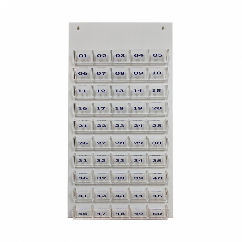Made from acrylic, white background, transparent slots, red numbers