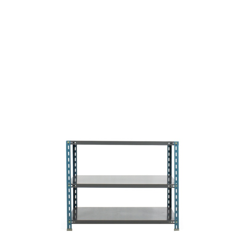 Material storage shelves, painted angle iron frame, shelves made from folded steel sheets