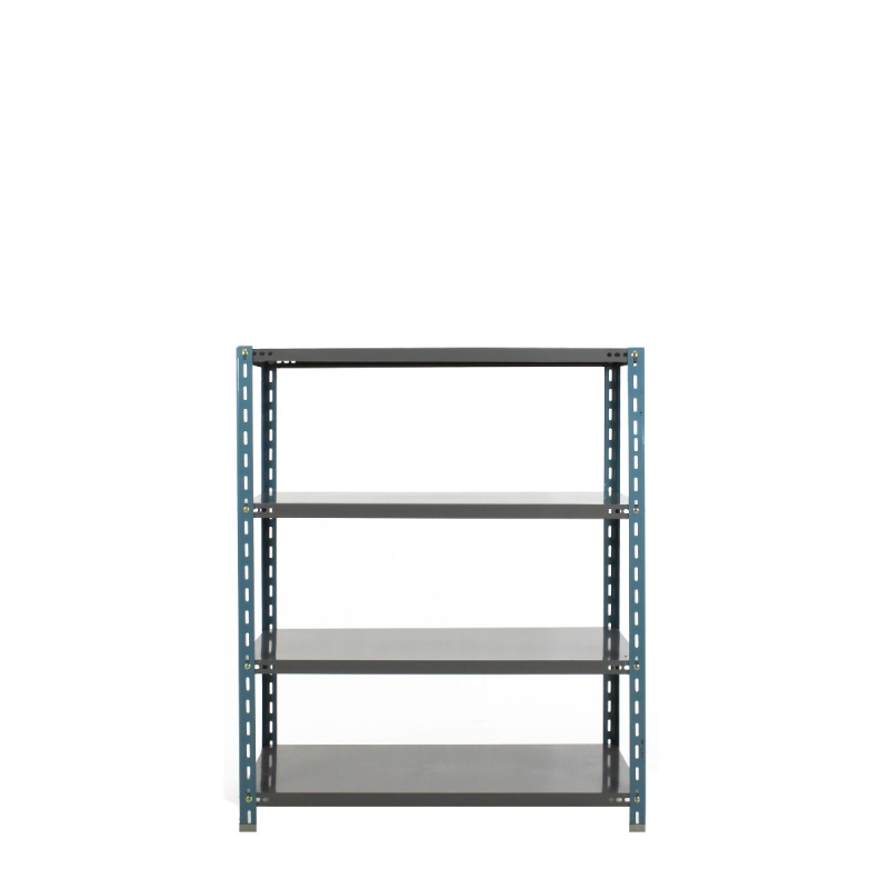 Shelves for storage of materials, painted angle iron frame, shelves made from folded steel sheets