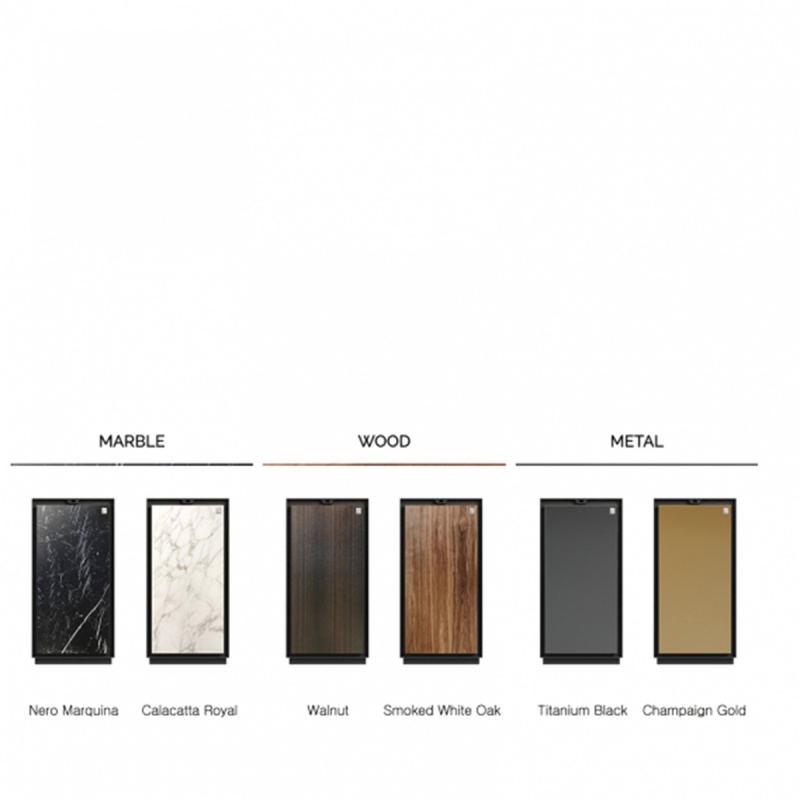 - There are 6 types of Front panels to choose from: Nero Marquina (black marble pattern), Calacatta Royal (white marble pattern), Walnut, Smoked White Oak, Titanium Black, Champaign Gold"