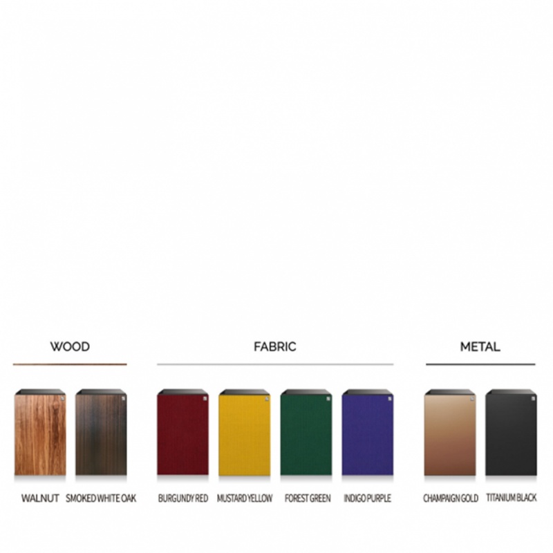 - There are 8 types of Front panel to choose from: : Walnut, Smoked White Oak, Titanium Black, Champaign Gold, Burgundy red (fabric), Mustard yellow (fabric), Forest green (fabric), Indigo purple (fabric)