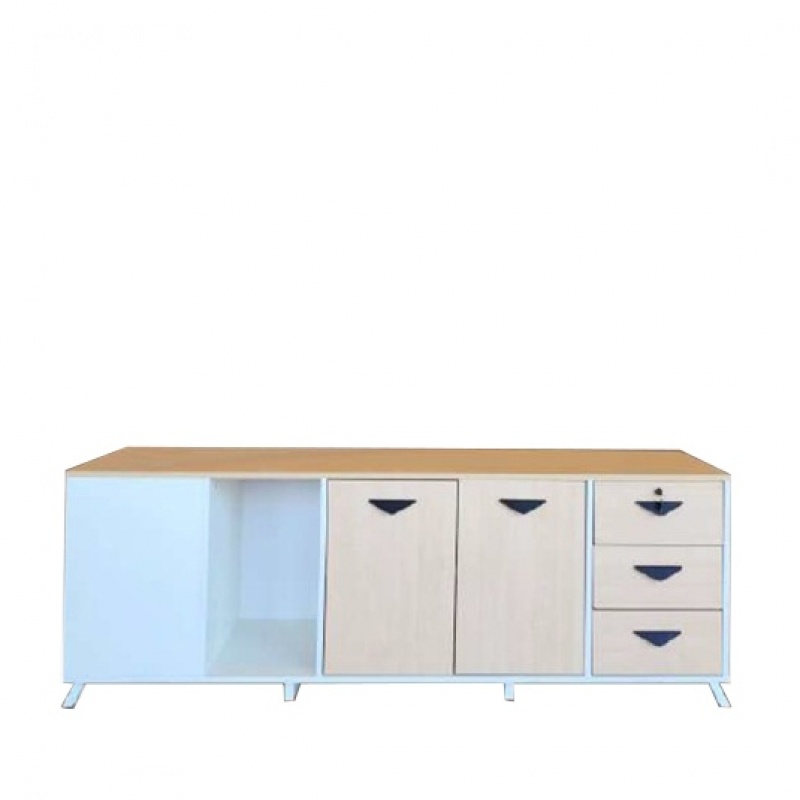 Sideboard with 1 open space on the left, 2 open doors in the middle, 3 drawers on the right