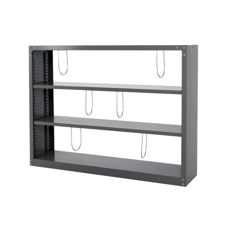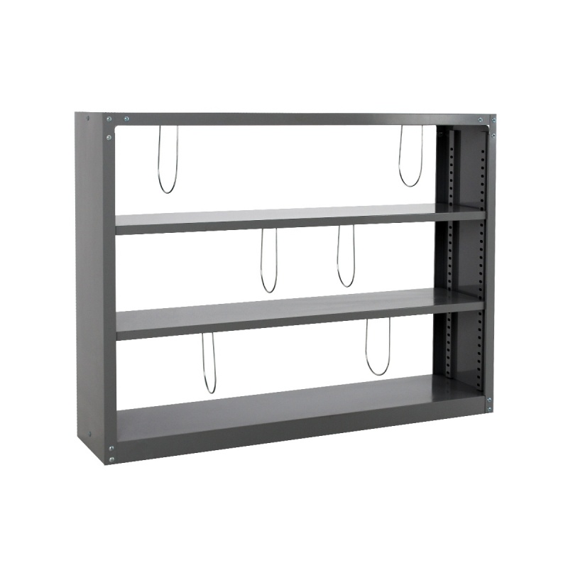Open file storage with wire to prevent documents from falling. The shelf can be removed and adjusted to different heights.