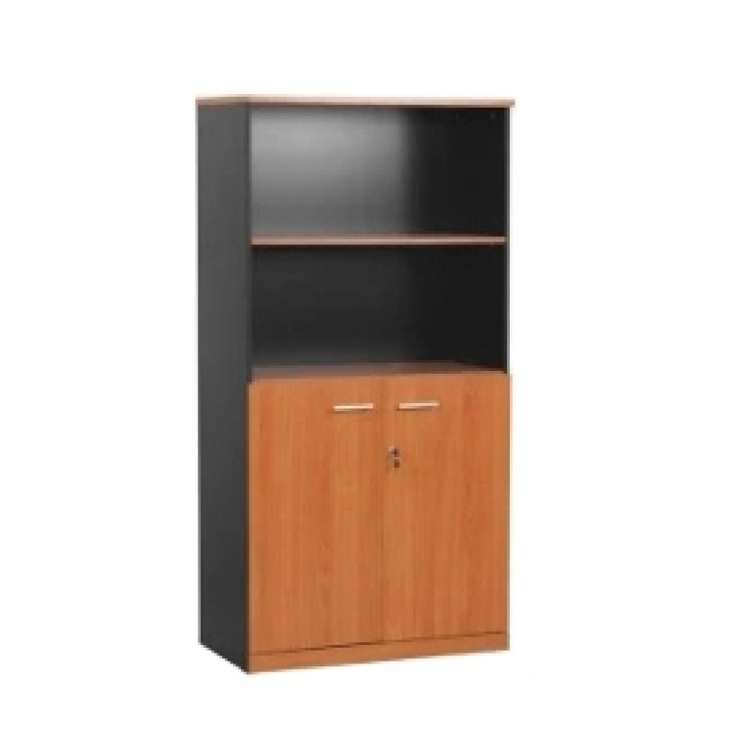 Wooden document cabinet with 2 open shelves on top and 2 closed compartments with doors at the bottom