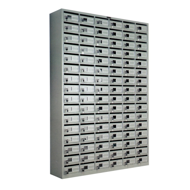 Mailbox with separate locking keys for each compartment and a clear glass window for viewing inside the compartment. There is a name tag. The cabinet is made of 0.7-1.2 mm thick steel.