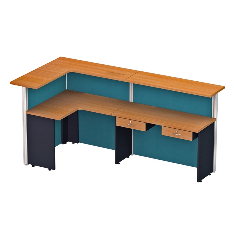 โต๊ะเคาน์เตอร์ไม้รูปตัวแอล ประกอบด้วย โต๊ะทำงานพร้อมโต๊ะต่อข้าง มี 2 ลิ้นชักกลาง และชุดฉากพร้อมท็อปเคาน์เตอร์