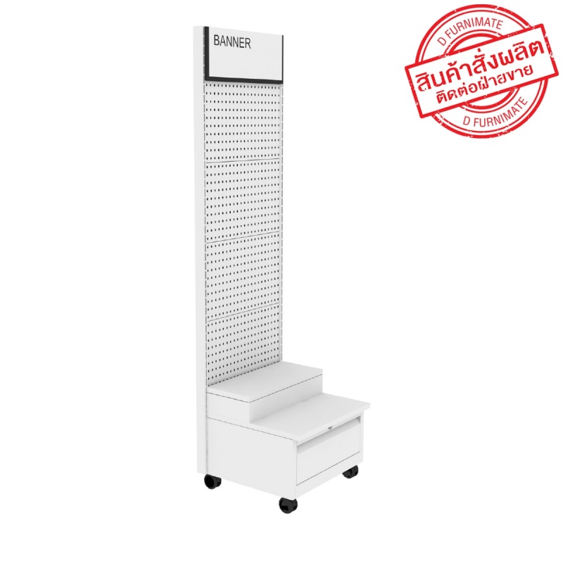 ชั้นวางจำหน่ายสินค้าแบบแขวนได้พร้อมตู้แบบติดล้อ มีที่ใส่แบนเนอร์ด้านบนProduct Details